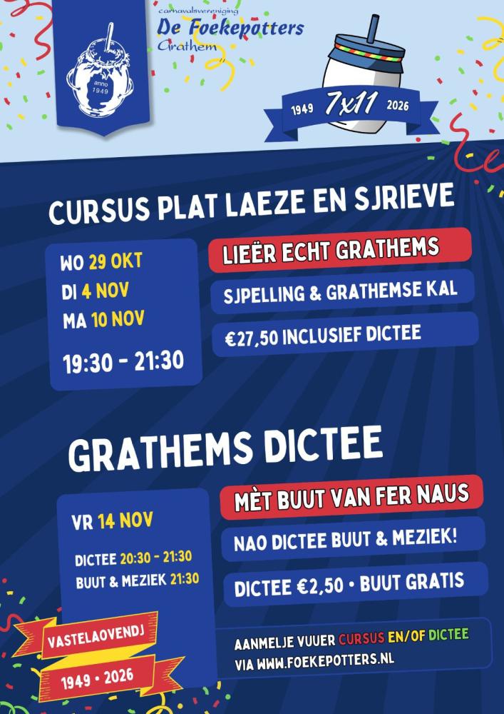 Op vriedig 14 november vanaaf 20.30 oor is der ein waar Grathems Dictee met nao aafloup eine buut van nemes minder es Fer Naus aansloetendj is der muziek.