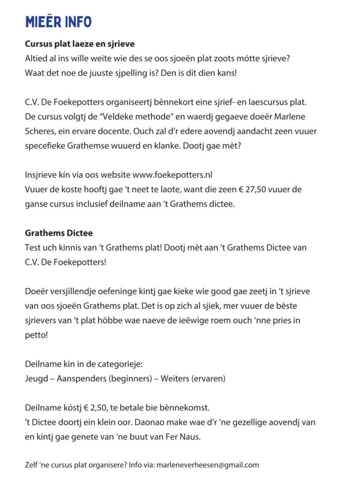 Woe 29 okt, Di 4 nov en 10 november en gaef dich op vuuer de cursus plat laeze en sjrieve. Opgaeve kan via de aanmeldknop op de homepage van de site. Alle daag van 19.30 - 21.30 oor inne Nassaurie.